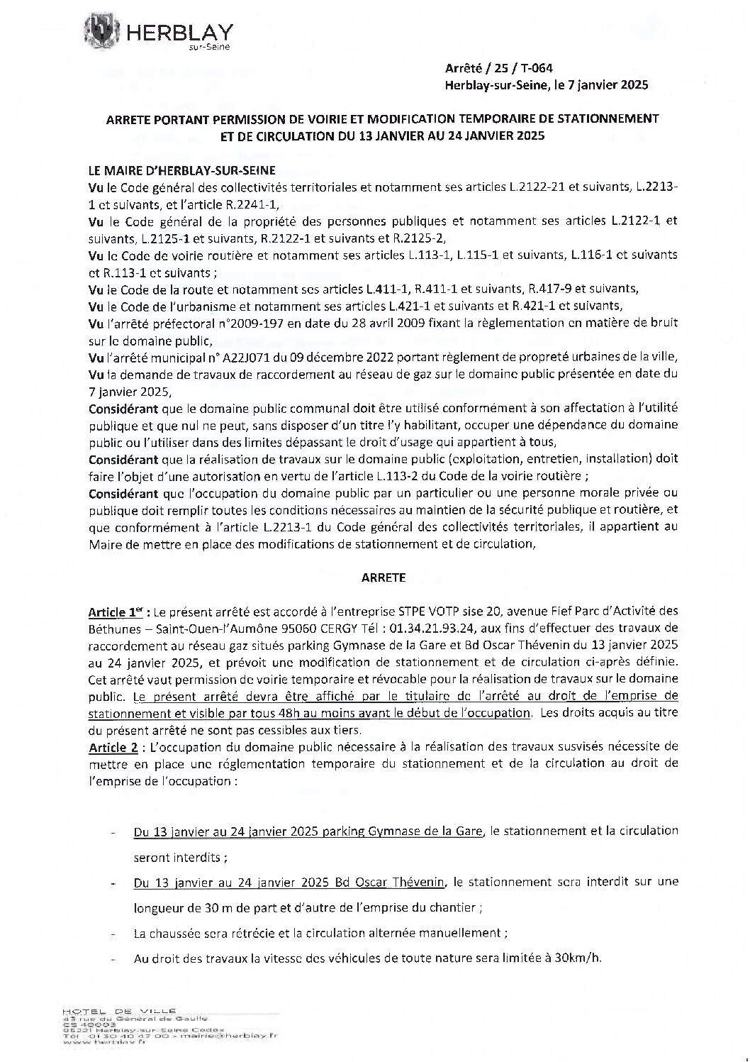 Arrêté portant permission de voirie et modification temporaire de stationnement et de circulation BD Oscar Thévenin