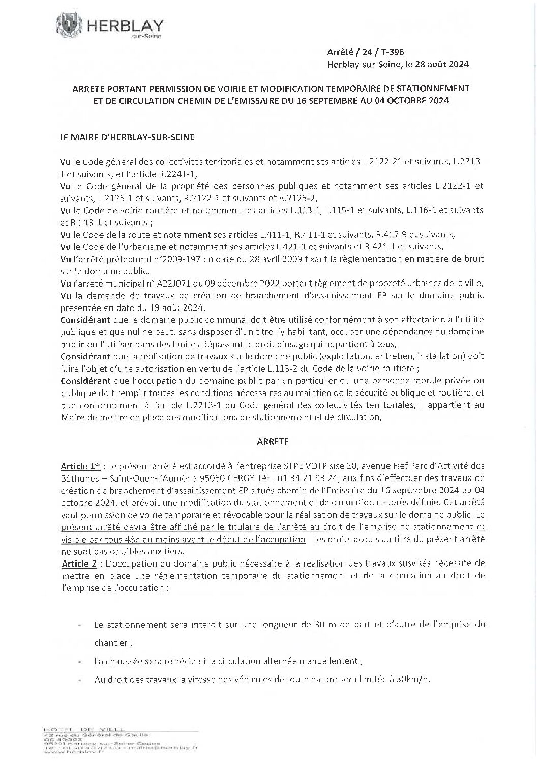Arrêté portant permission de voirie et modification temporaire de stationnement et de circulation chemin de l’Émissaire