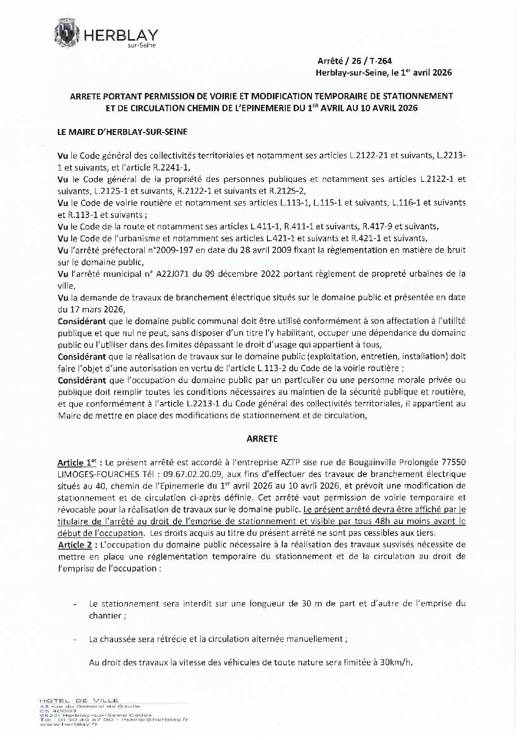 Arrêté portant permission de voirie et modification temporaire de stationnement et de circulation chemin de l’Epinemerie