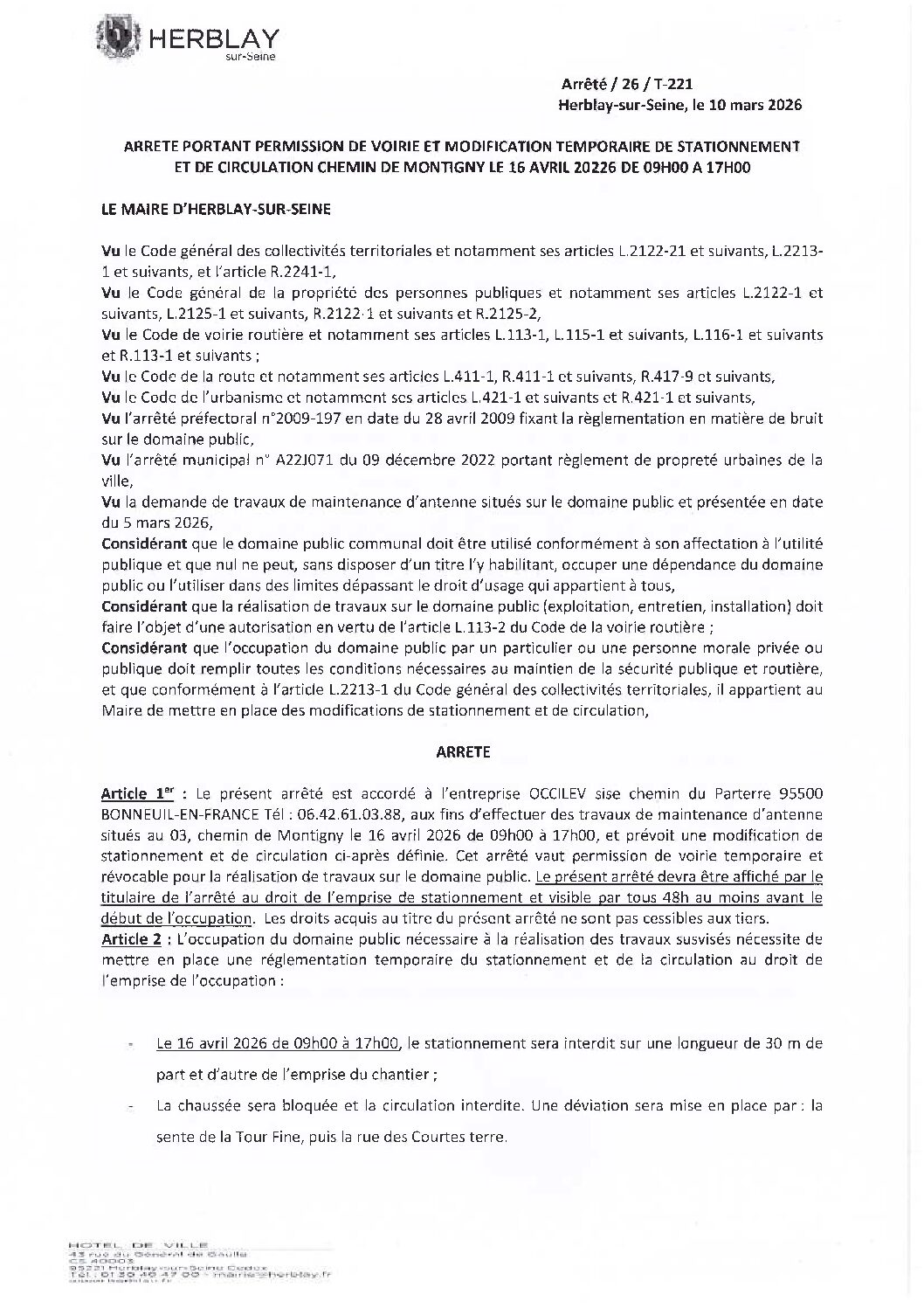 Arrêté portant permission de voirie et modification temporaire de stationnement et de circulation chemin de Montigny