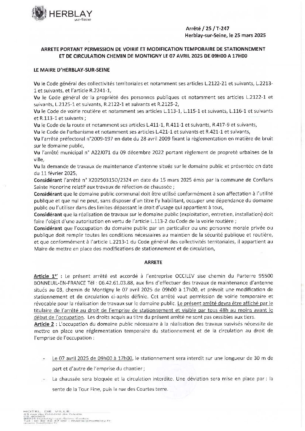 Arrêté portant permission de voirie et modification temporaire de stationnement et de circulation chemin de Montigny