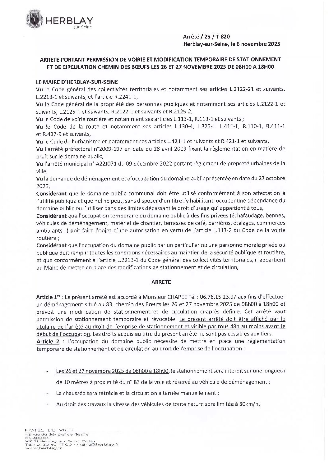 Arrêté portant permission de voirie et modification temporaire de stationnement et de circulation chemin des Bœufs