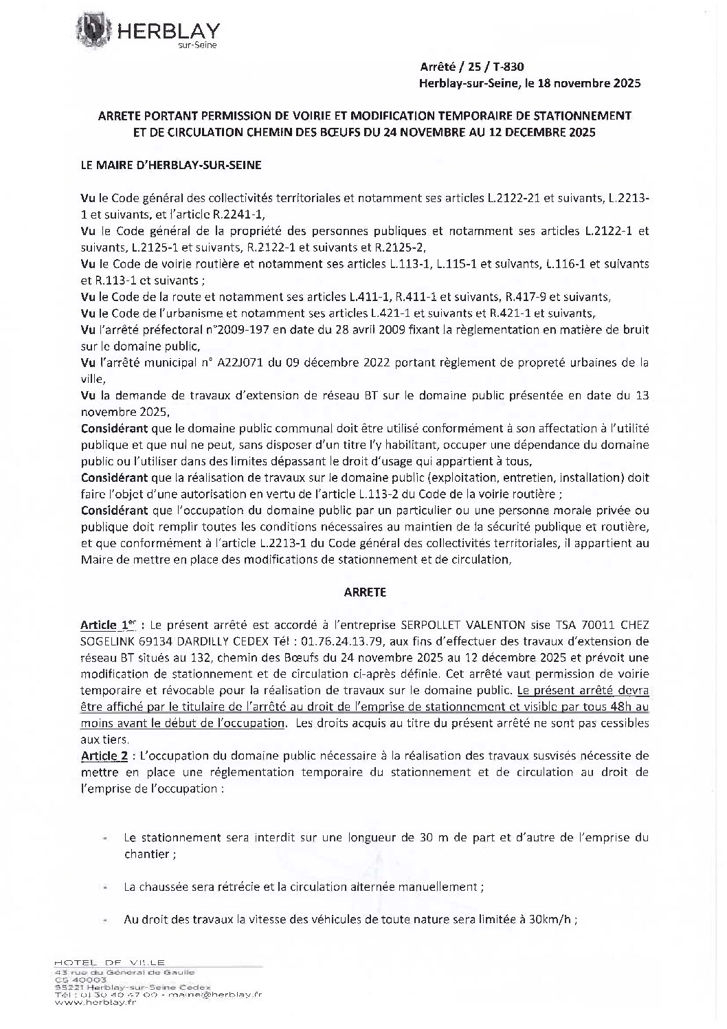 Arrêté portant permission de voirie et modification temporaire de stationnement et de circulation chemin des Bœufs