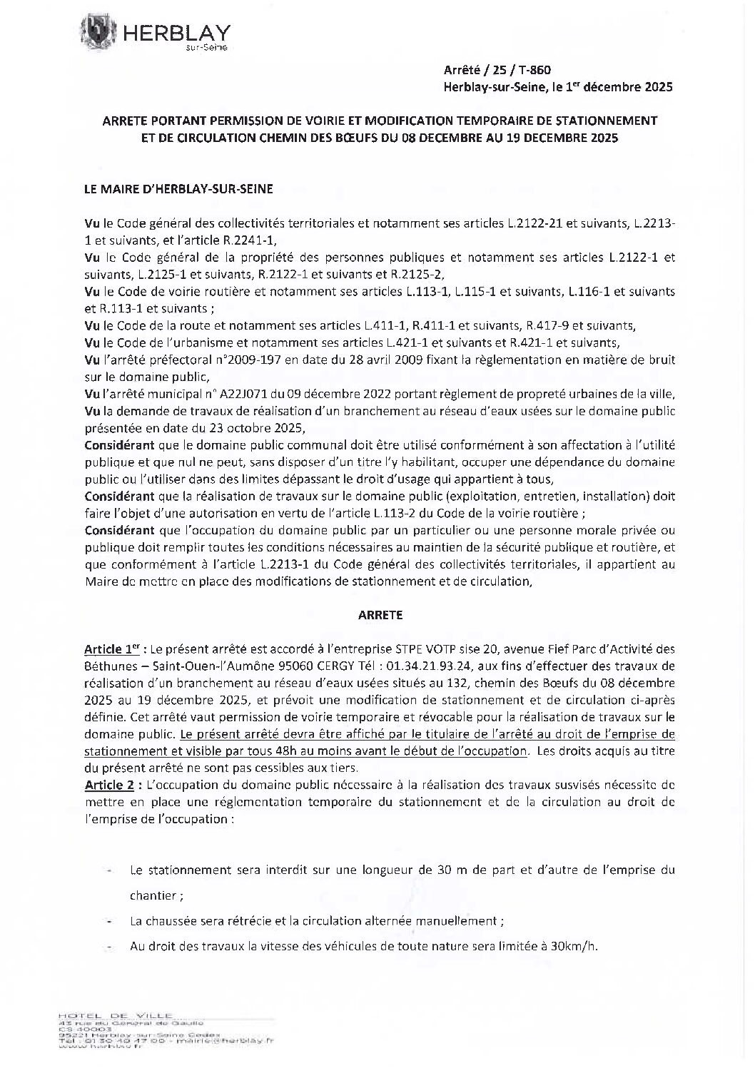 Arrêté portant permission de voirie et modification temporaire de stationnement et de circulation chemin des Bœufs
