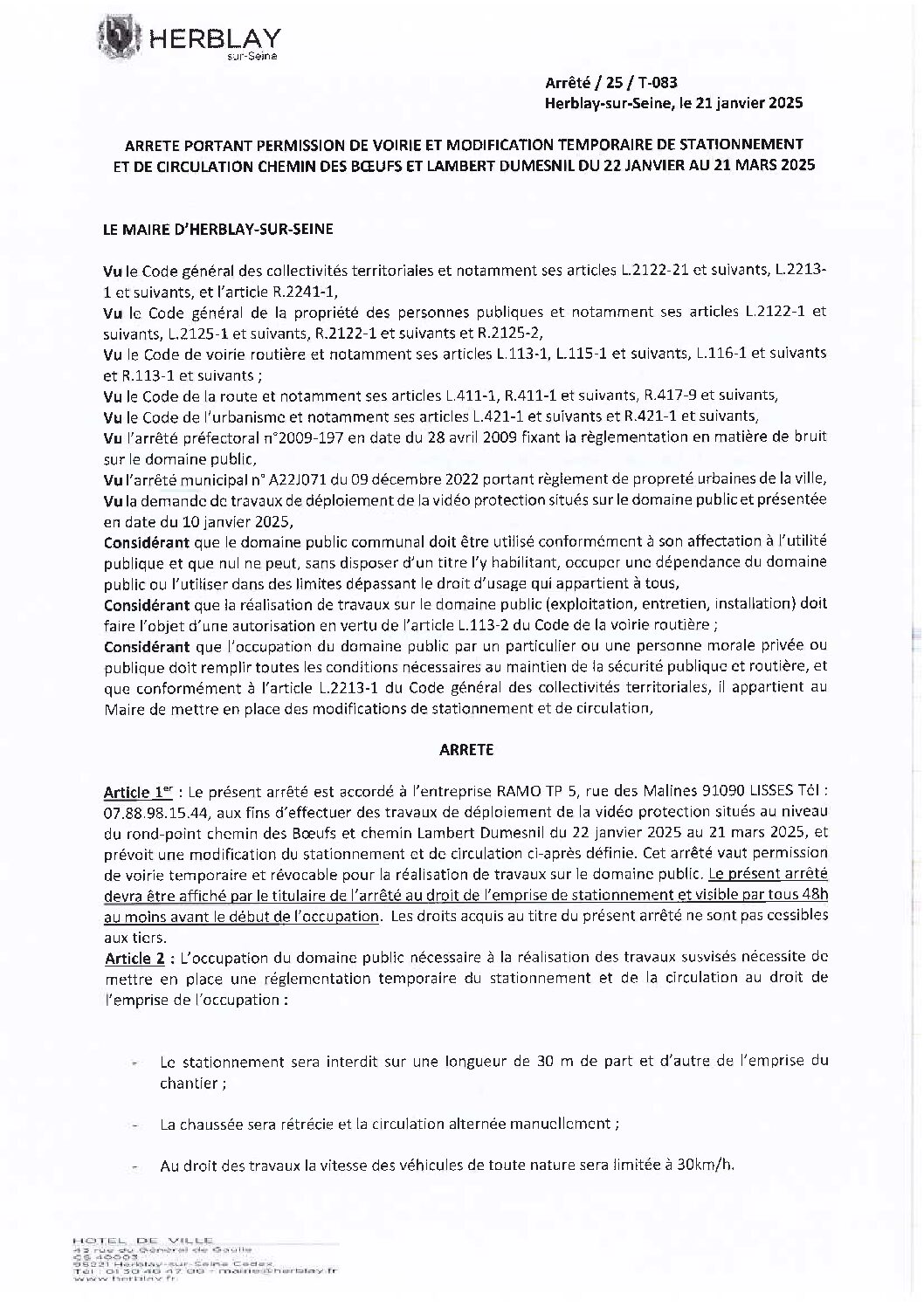 Arrêté portant permission de voirie et modification temporaire de stationnement et de circulation chemin des Bœufs et chemin Lambert Dumesnil