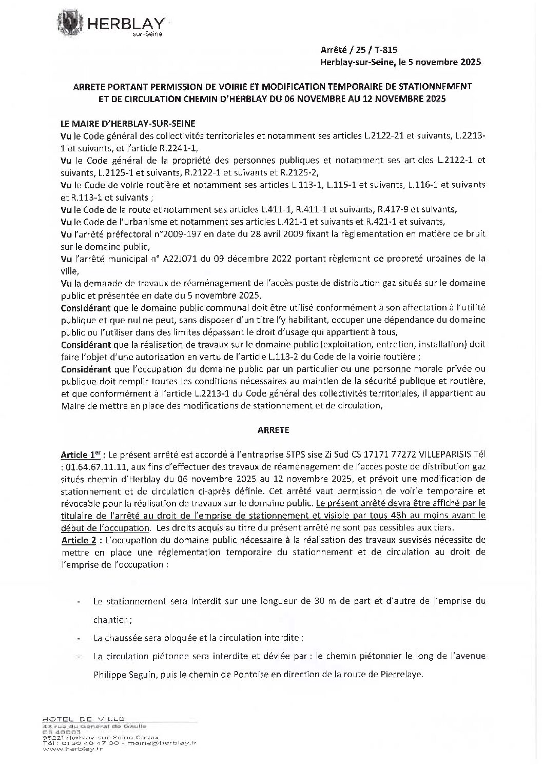 Arrêté portant permission de voirie et modification temporaire de stationnement et de circulation chemin d’Herblay