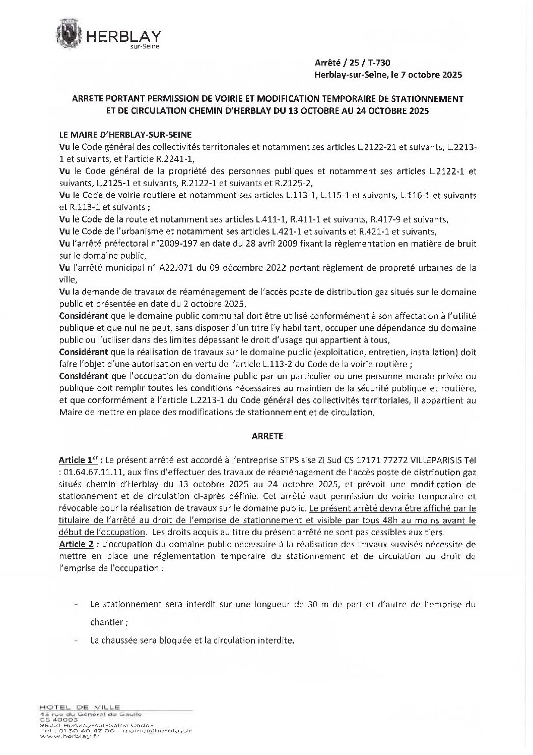 Arrêté portant permission de voirie et modification temporaire de stationnement et de circulation chemin d’Herblay