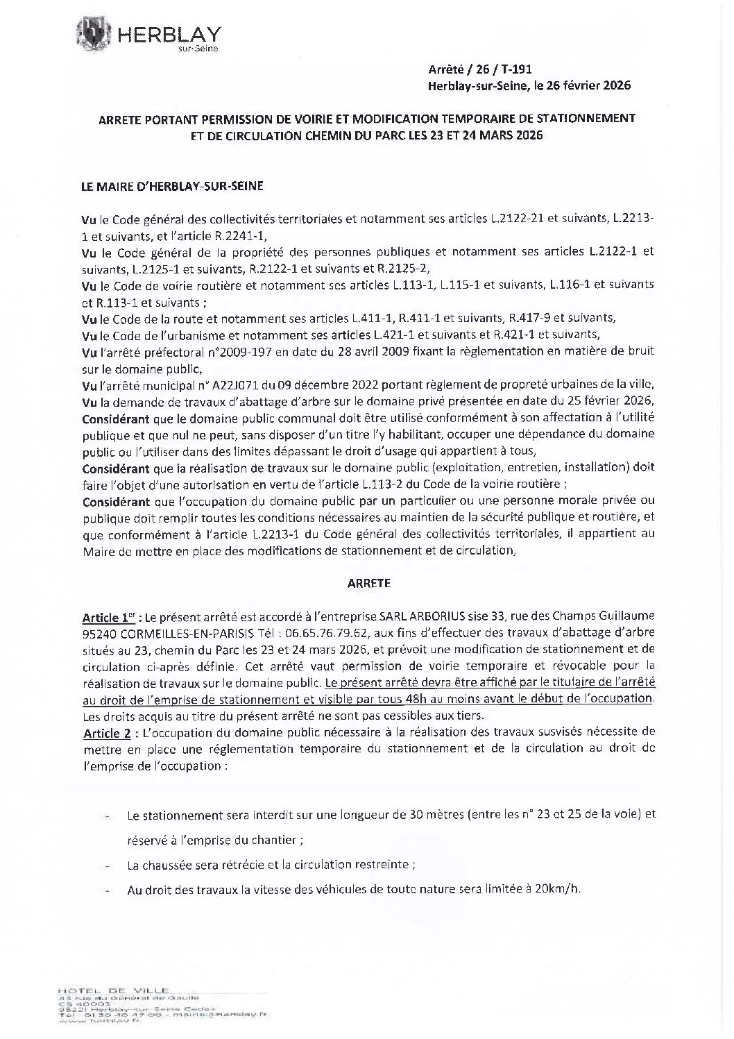 Arrêté portant permission de voirie et modification temporaire de stationnement et de circulation chemin du Parc