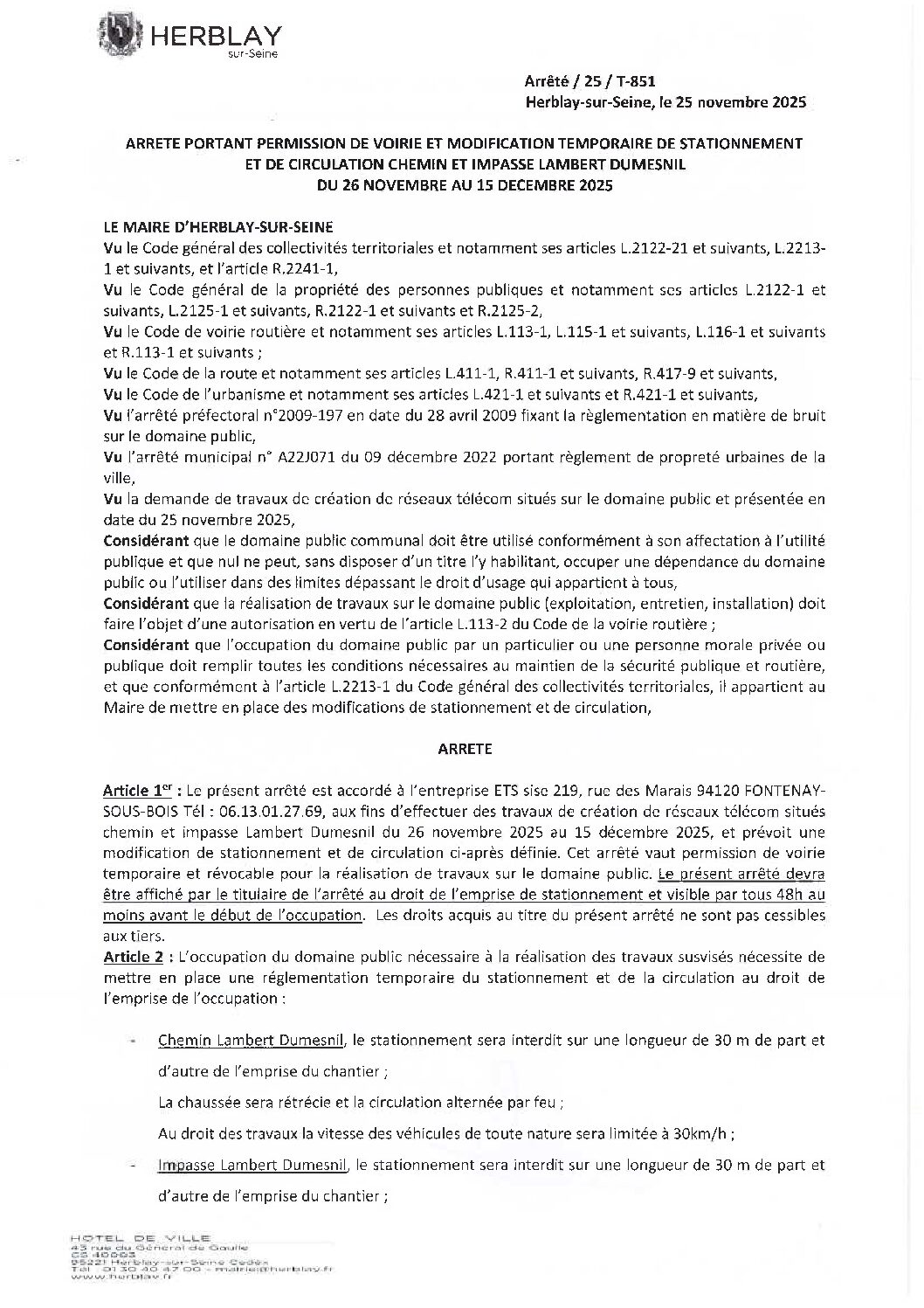 Arrêté portant permission de voirie et modification temporaire de stationnement et de circulation chemin et impasse Lambert Dumesnil