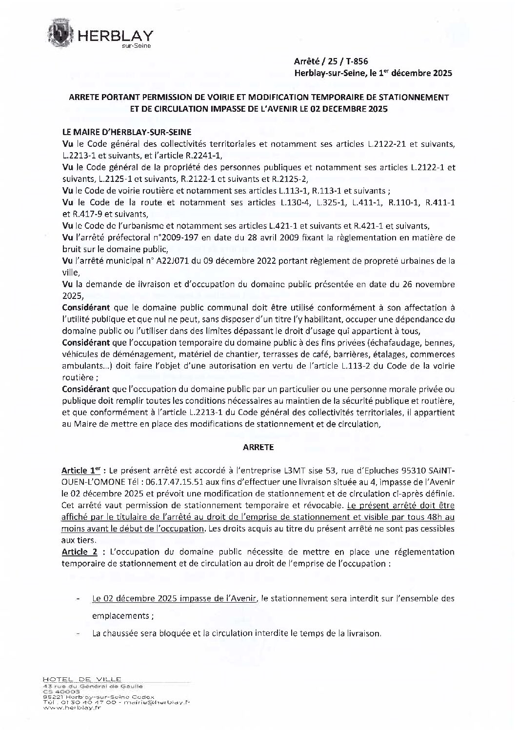 Arrêté portant permission de voirie et modification temporaire de stationnement et de circulation impasse de l’Avenir