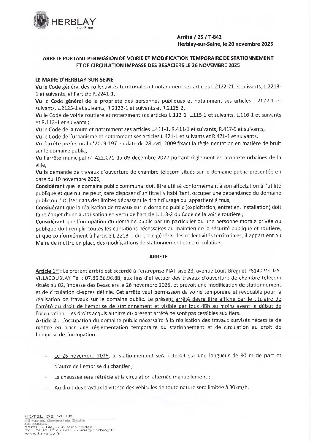 Arrêté portant permission de voirie et modification temporaire de stationnement et de circulation impasse des Besaciers