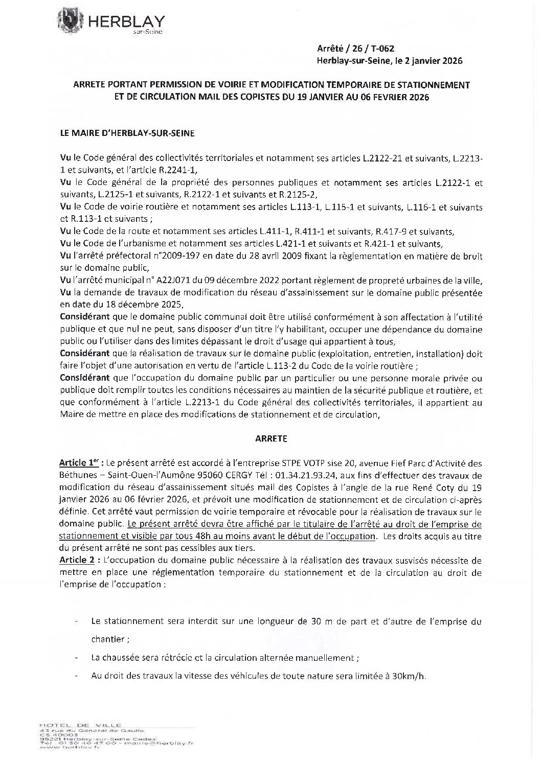 Arrêté portant permission de voirie et modification temporaire de stationnement et de circulation mail des Copistes