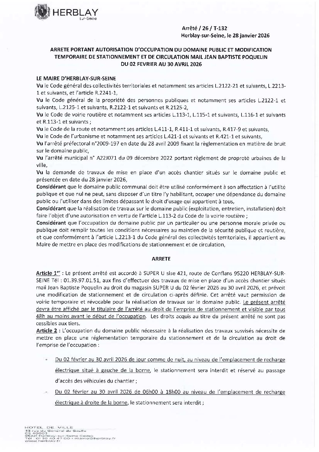 Arrêté portant permission de voirie et modification temporaire de stationnement et de circulation mail Jean Baptiste Poquelin