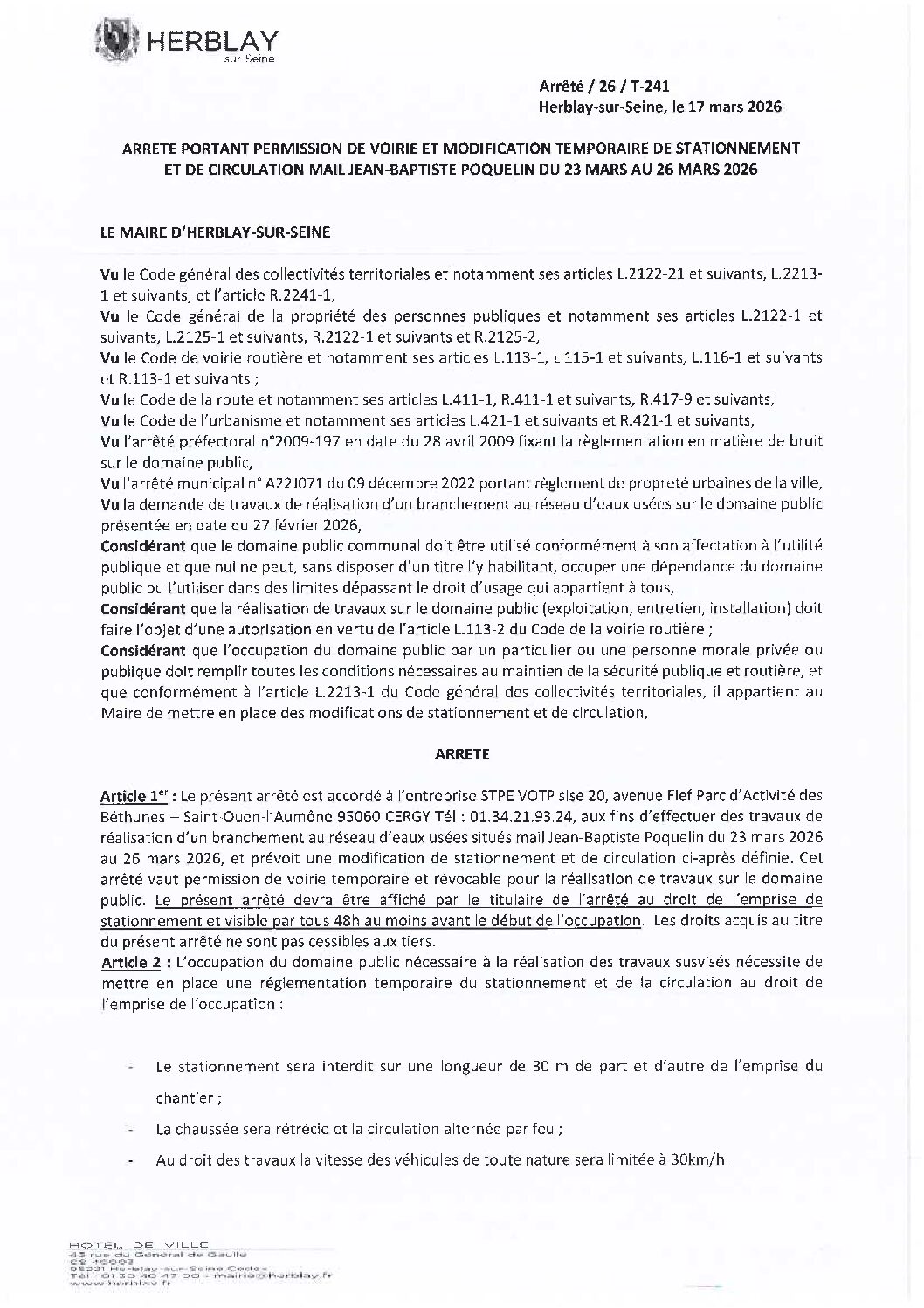 Arrêté portant permission de voirie et modification temporaire de stationnement et de circulation mail Jean- Baptiste Poquelin