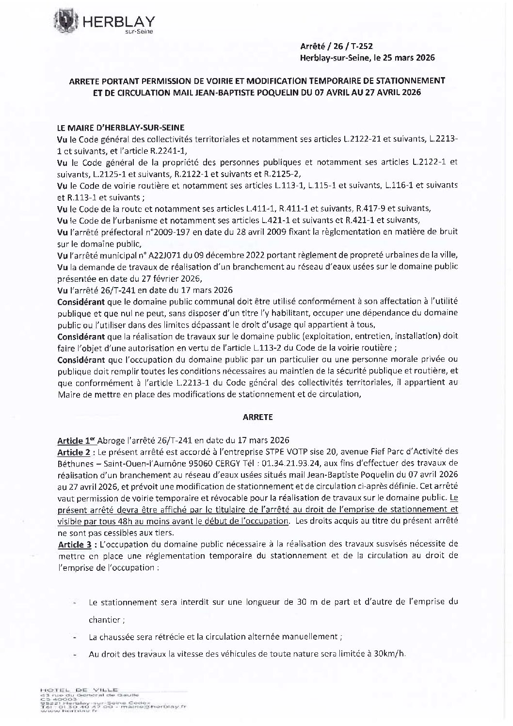 Arrêté portant permission de voirie et modification temporaire de stationnement et de circulation mail Jean-Baptiste Poquelin
