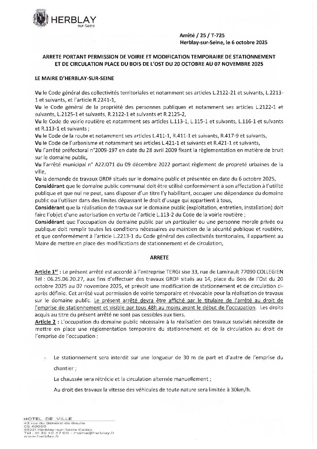 Arrêté portant permission de voirie et modification temporaire de stationnement et de circulation place du Bois de l’Ost