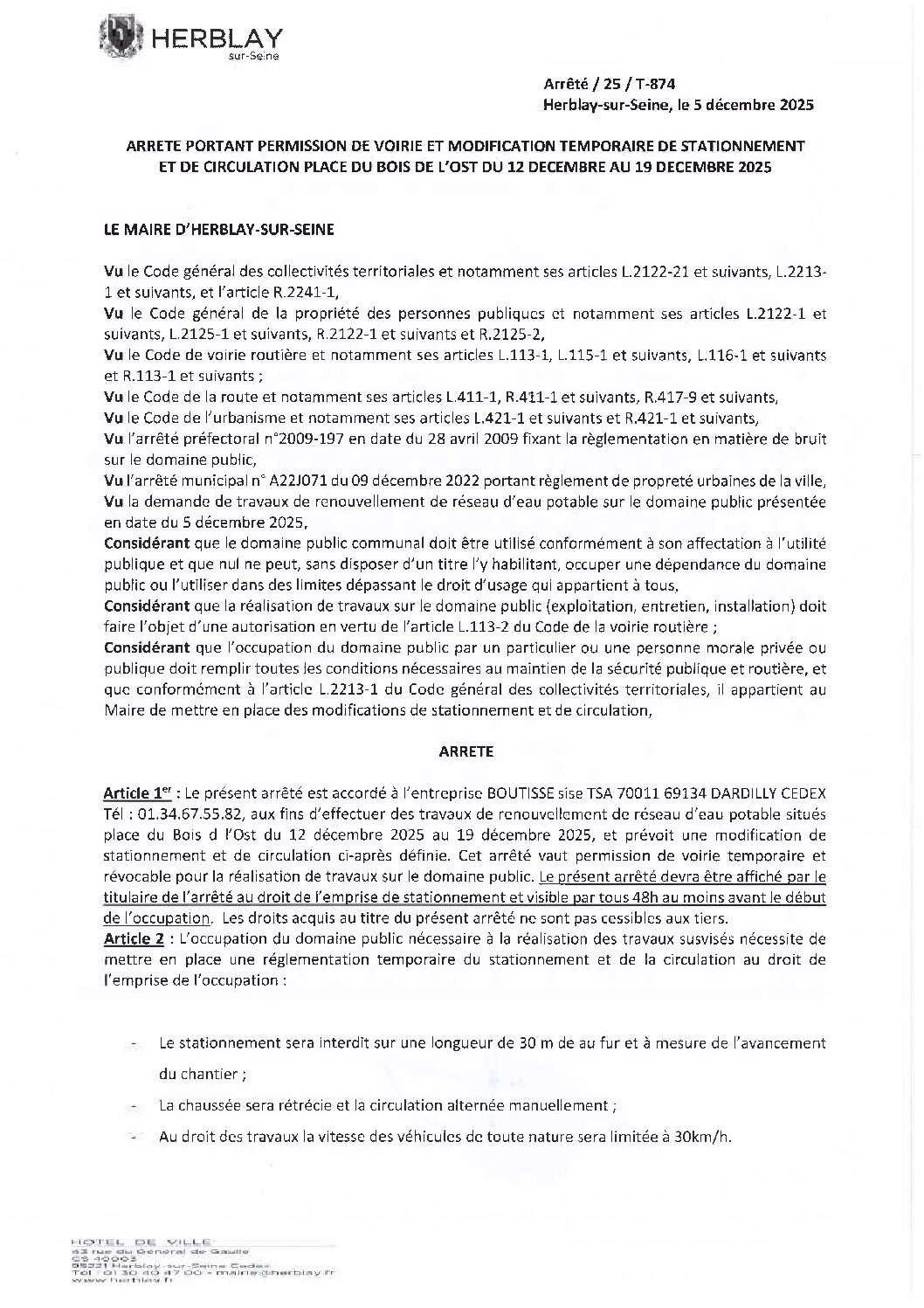Arrêtés : Arrêté portant permission de voirie et modification temporaire de stationnement et de circulation place du Bois de l’Ost 5 décembre 2025