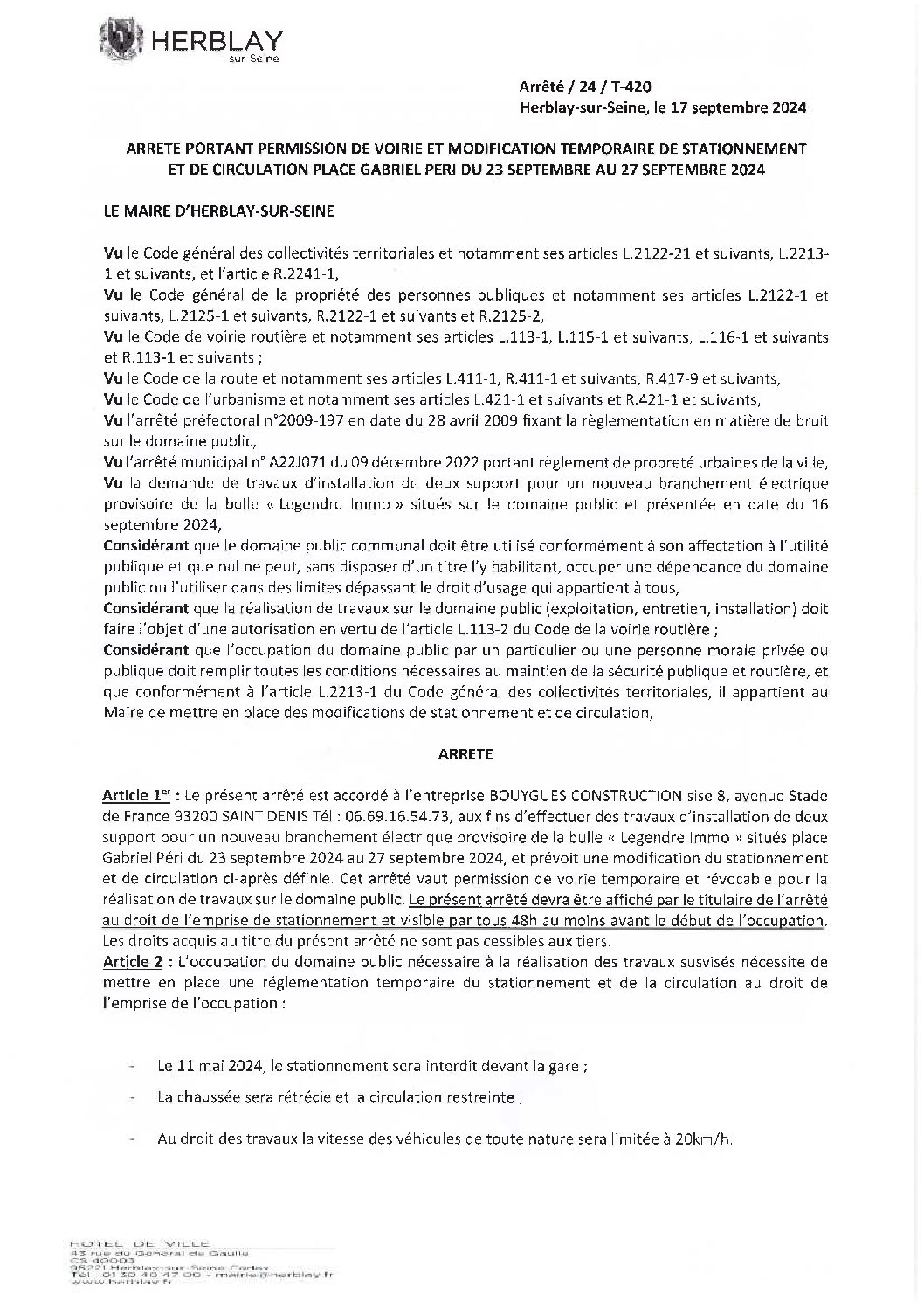 Arrêté portant permission de voirie et modification temporaire de stationnement et de circulation place Gabriel Péri