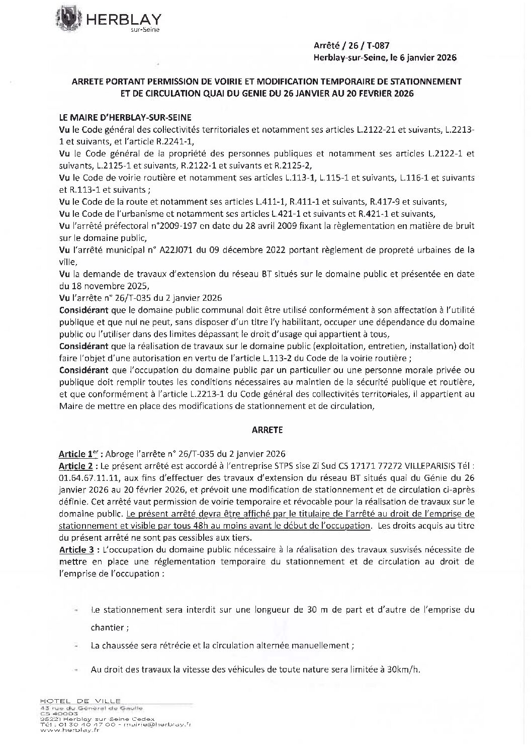 Arrêté portant permission de voirie et modification temporaire de stationnement et de circulation quai du Génie