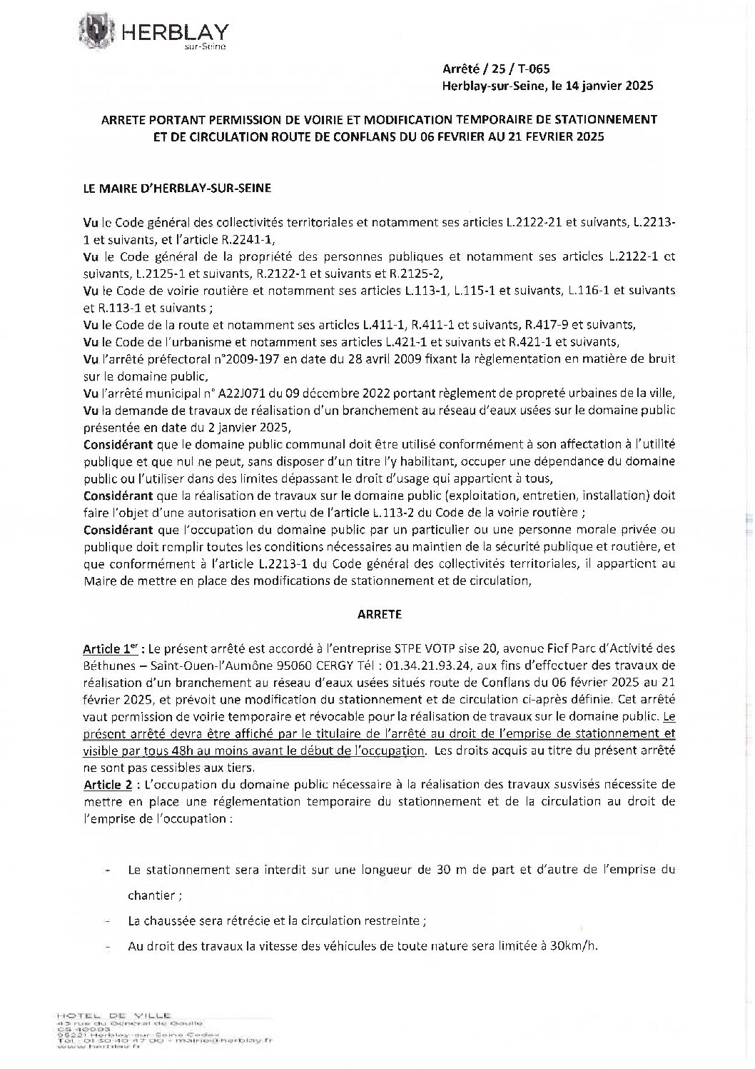 Arrêté portant permission de voirie et modification temporaire de stationnement et de circulation route de Conflans