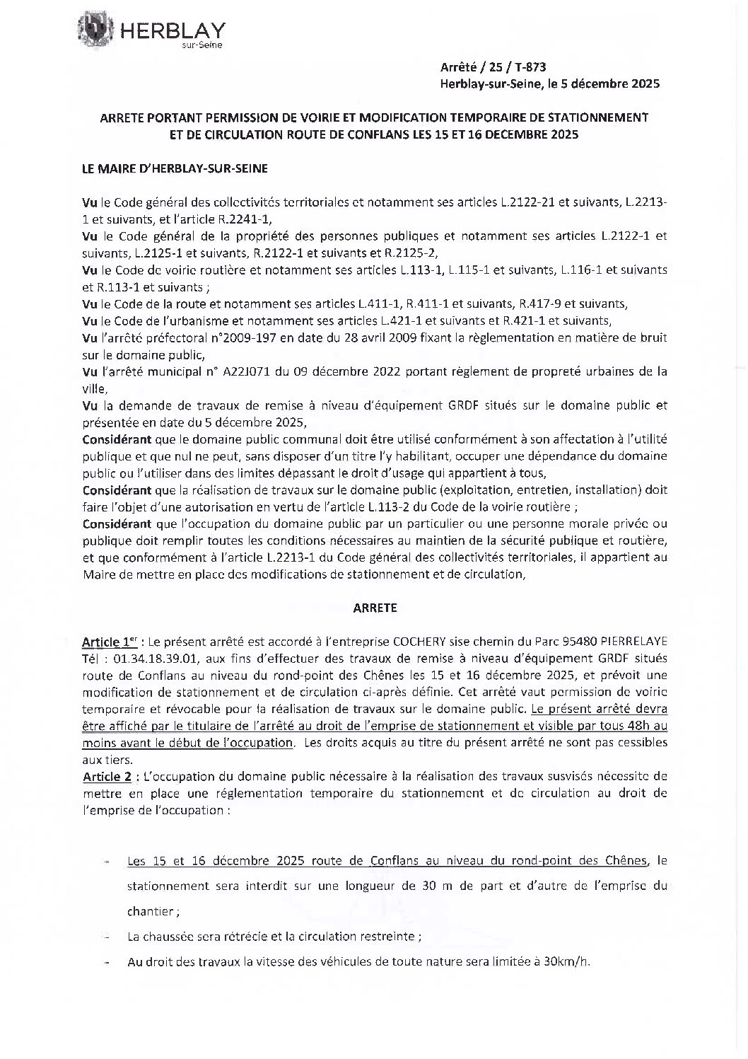 Arrêtés : Arrêté portant permission de voirie et modification temporaire de stationnement et de circulation route de Conflans 5 décembre 2025
