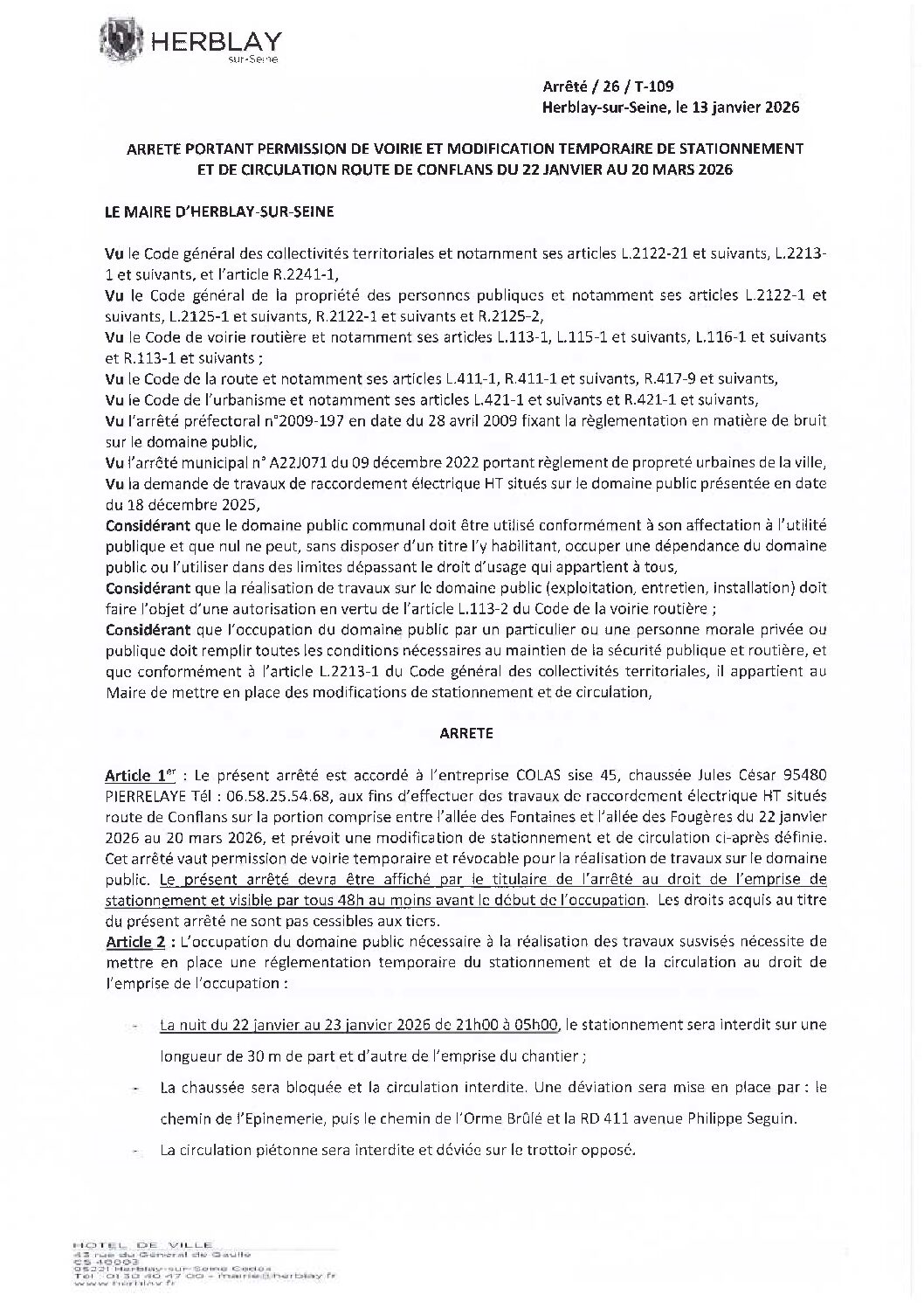 Arrêté portant permission de voirie et modification temporaire de stationnement et de circulation route de Conflans