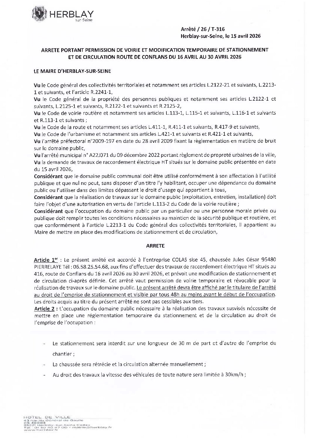 Arrêté portant permission de voirie et modification temporaire de stationnement et de circulation route de Conflans