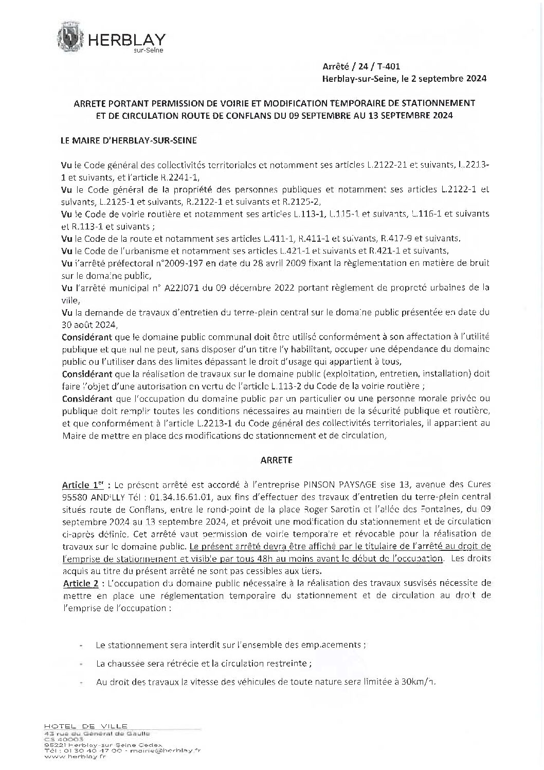 Arrêté portant permission de voirie et modification temporaire de stationnement et de circulation route de Conflans