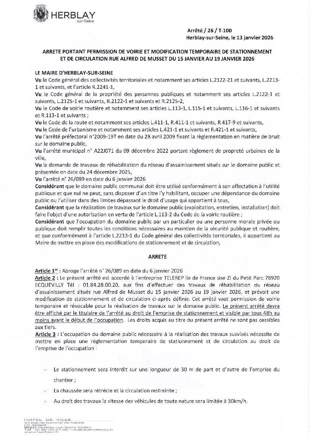 Arrêté portant permission de voirie et modification temporaire de stationnement et de circulation rue Alfred de Musset