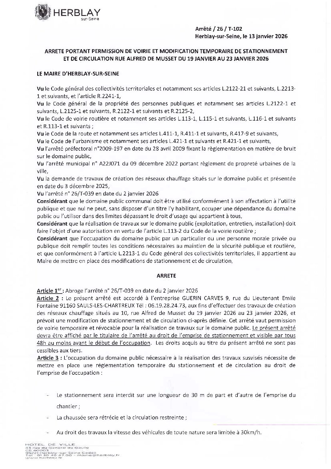 Arrêté portant permission de voirie et modification temporaire de stationnement et de circulation rue Alfred de