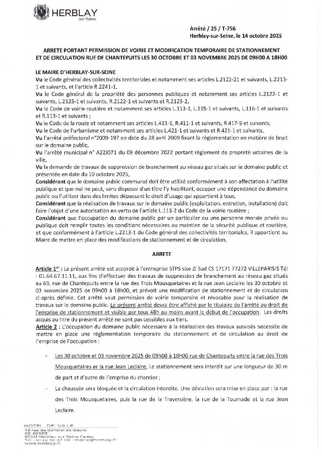 Arrêté portant permission de voirie et modification temporaire de stationnement et de circulation rue de Chantepuits