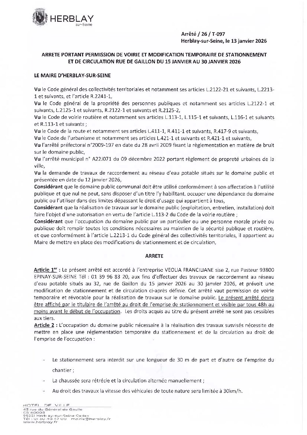 Arrêté portant permission de voirie et modification temporaire de stationnement et de circulation rue de Gaillon