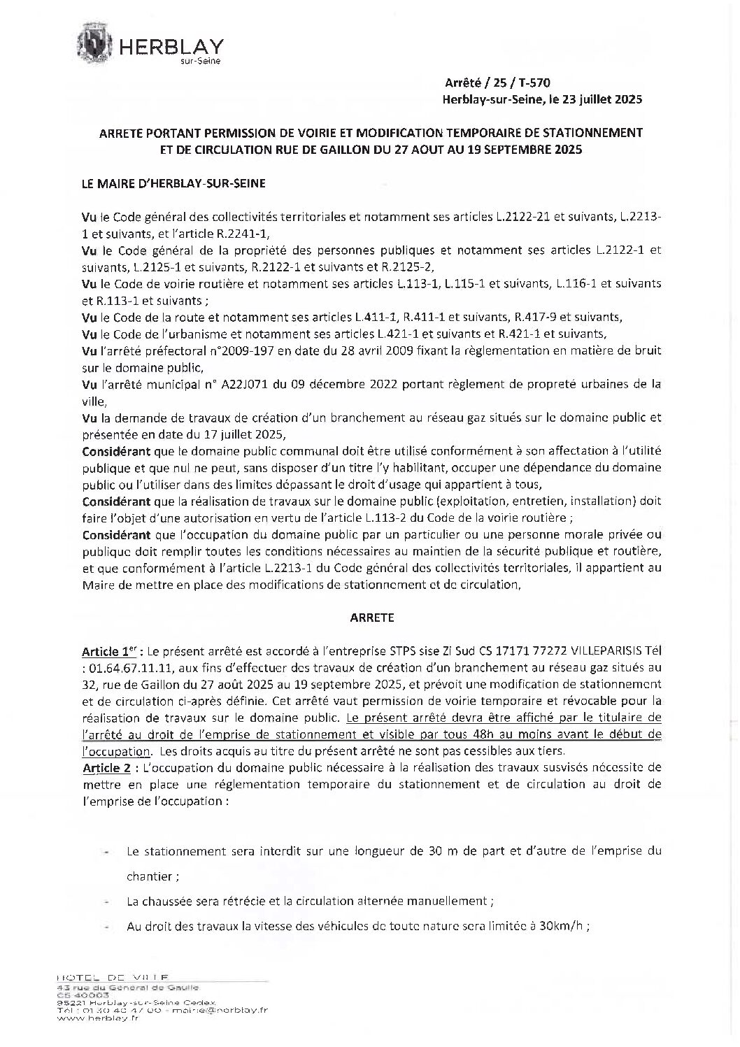 Arrêté portant permission de voirie et modification temporaire de stationnement et de circulation rue de Gaillon