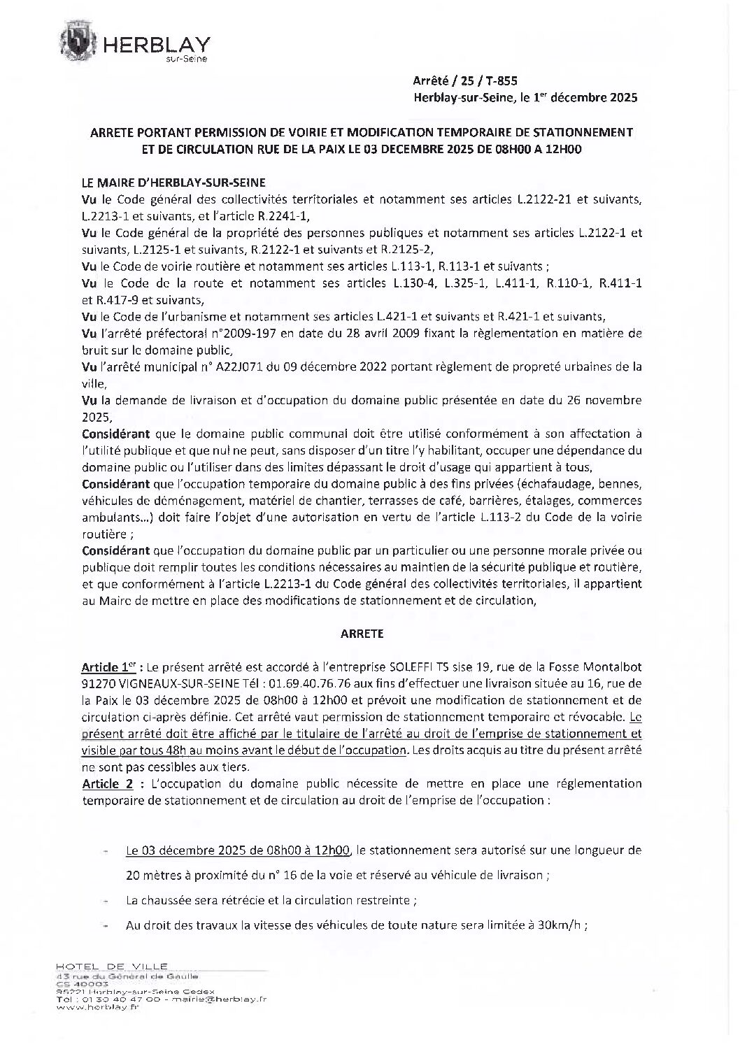 Arrêté portant permission de voirie et modification temporaire de stationnement et de circulation rue de la Paix