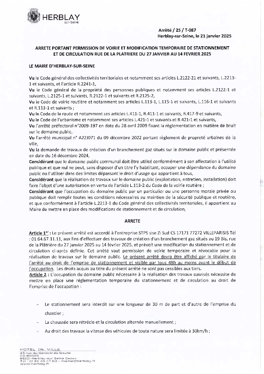 Arrêté portant permission de voirie et modification temporaire de stationnement et de circulation rue de la Plâtrière