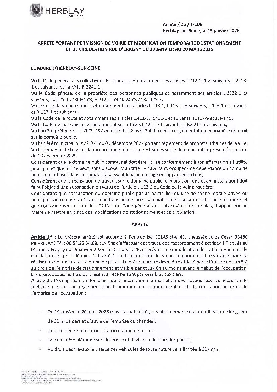 Arrêté portant permission de voirie et modification temporaire de stationnement et de circulation rue d’Éragny