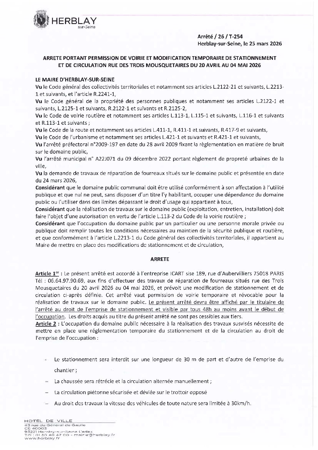 Arrêté portant permission de voirie et modification temporaire de stationnement et de circulation rue des Trois Mousquetaires