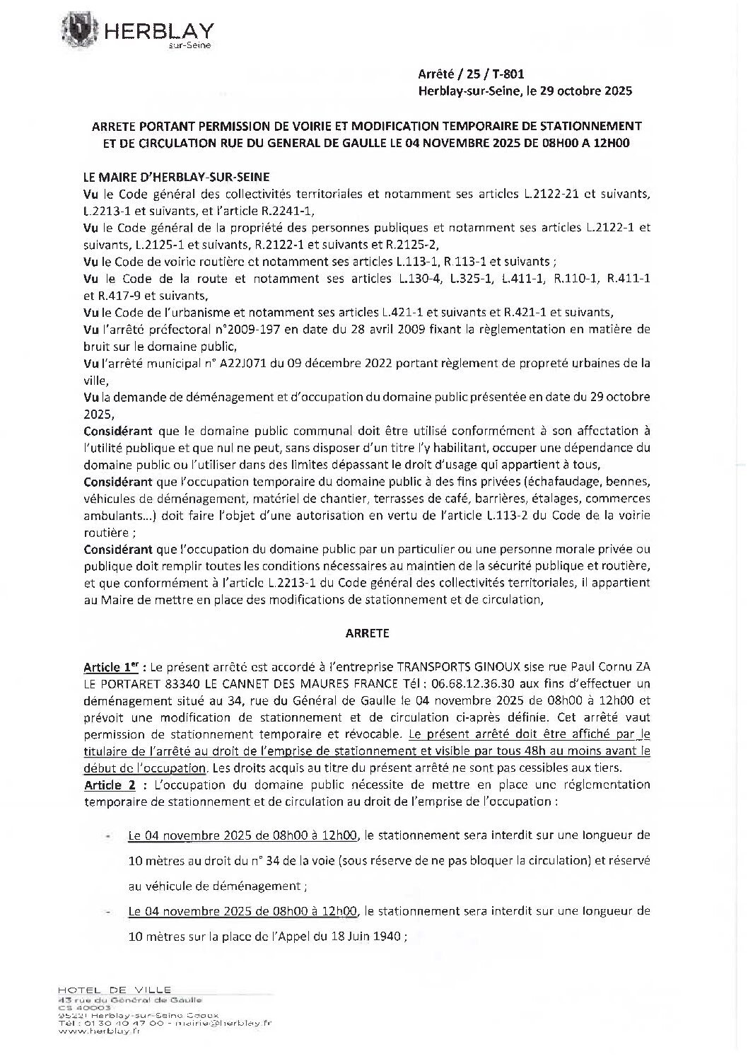 Arrêté portant permission de voirie et modification temporaire de stationnement et de circulation rue du Général de Gaulle