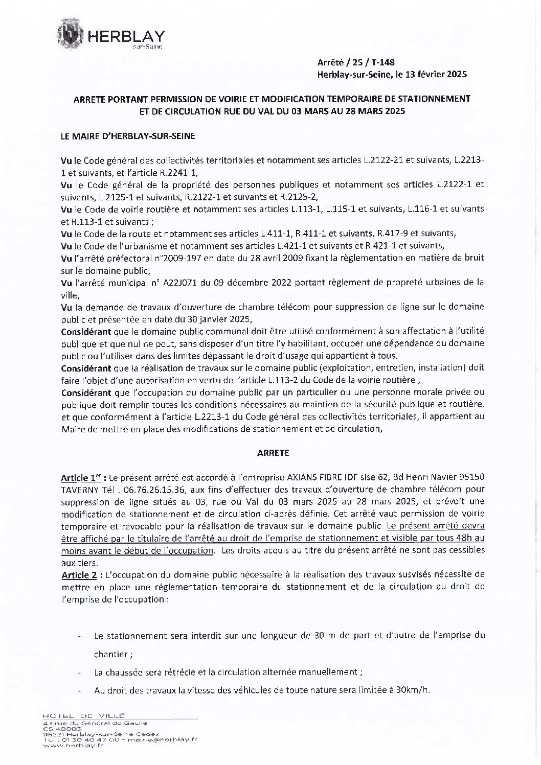 Arrêté portant permission de voirie et modification temporaire de stationnement et de circulation rue du Val
