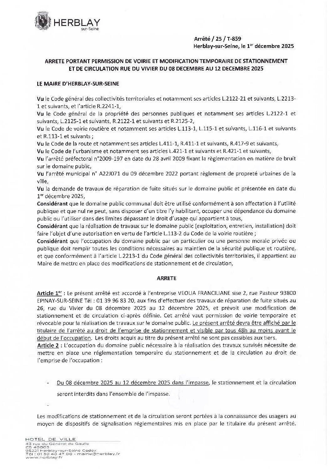 Arrêté portant permission de voirie et modification temporaire de stationnement et de circulation rue du Vivier