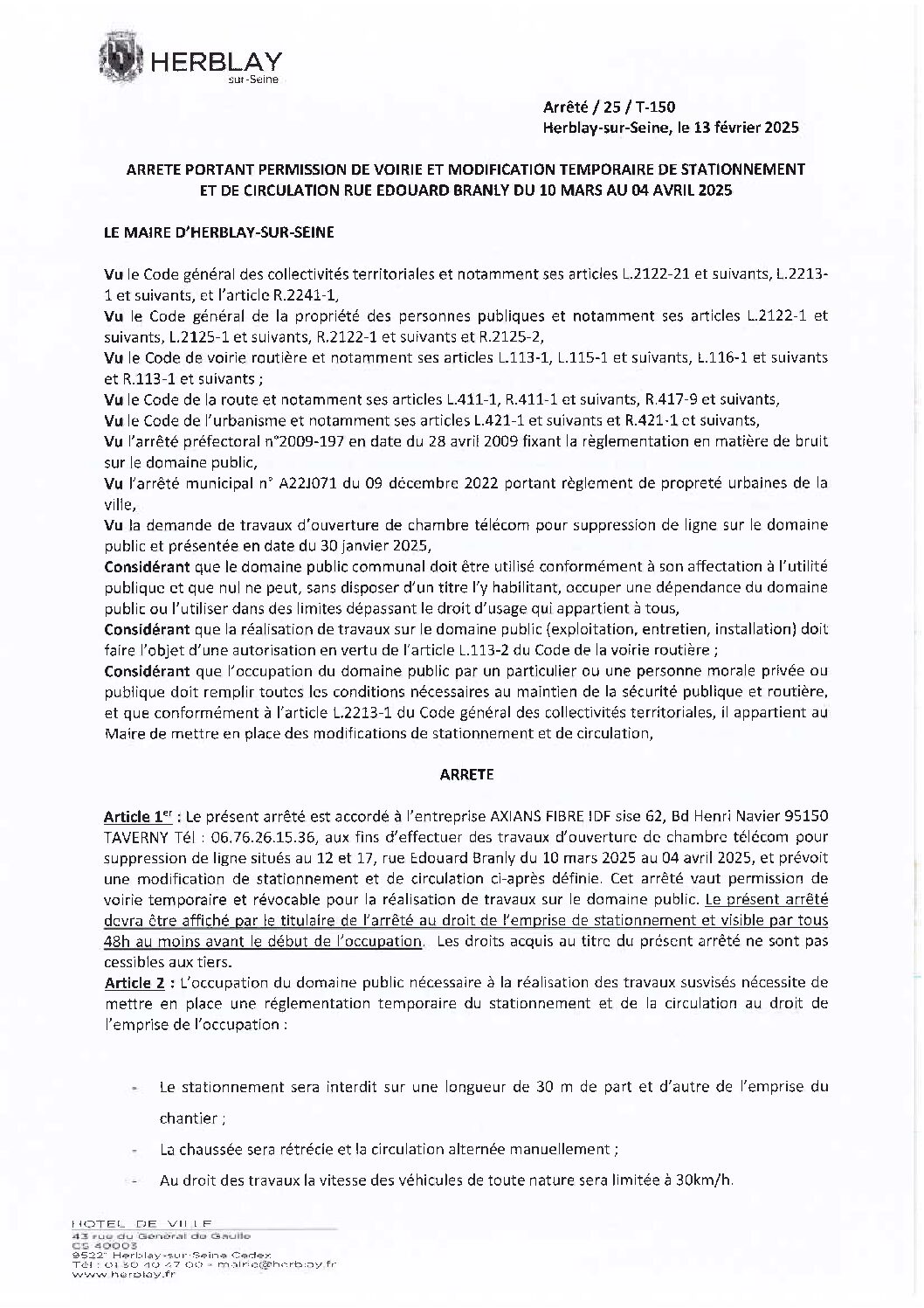 Arrêté portant permission de voirie et modification temporaire de stationnement et de circulation rue Édouard Branly
