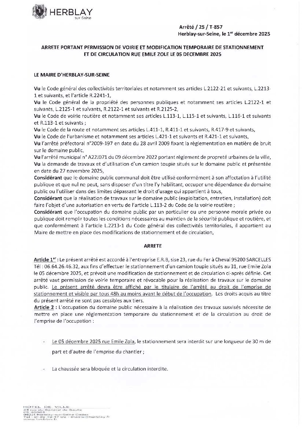 Arrêté portant permission de voirie et modification temporaire de stationnement et de circulation rue Émile Zola