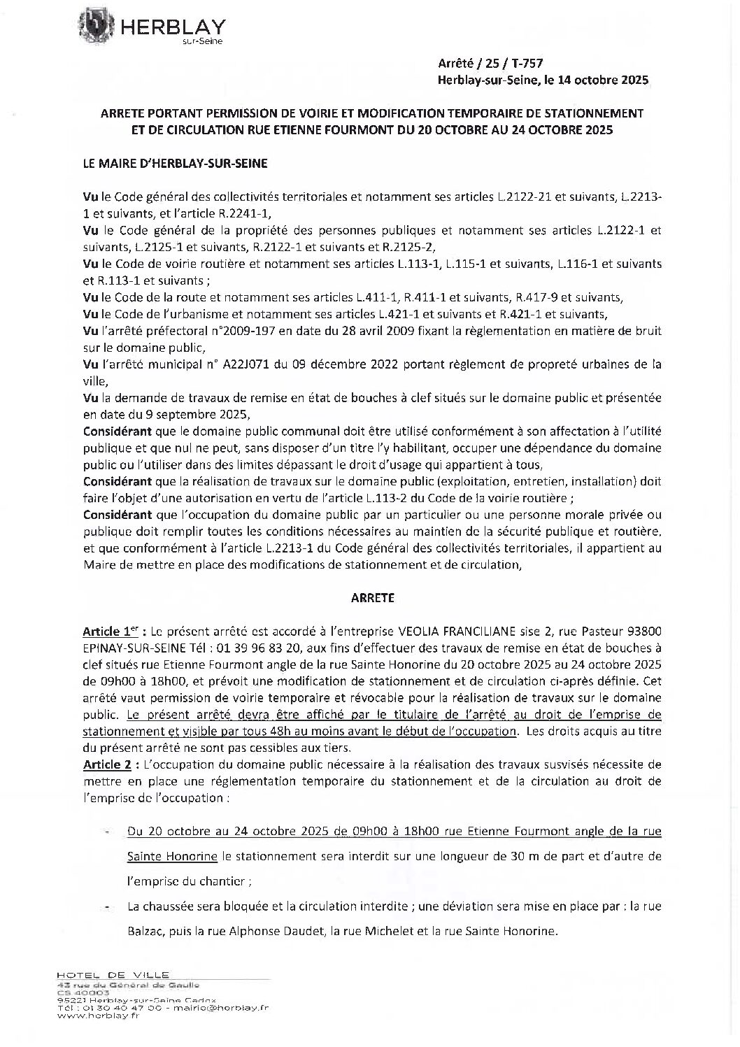 Arrêté portant permission de voirie et modification temporaire de stationnement et de circulation rue Étienne Fourmont