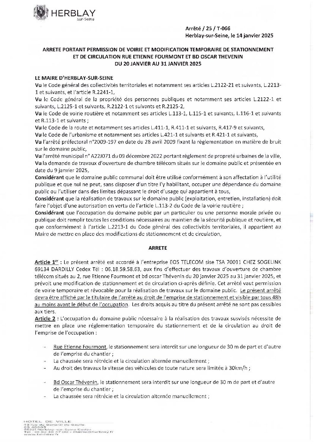Arrêté portant permission de voirie et modification temporaire de stationnement et de circulation rue Étienne Fourmont et BD Oscar Thévenin