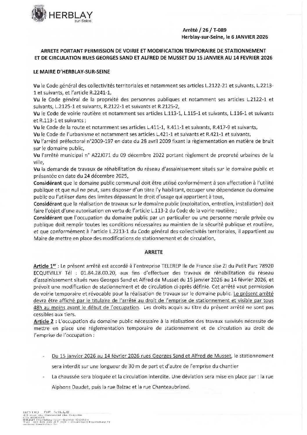 Arrêté portant permission de voirie et modification temporaire de stationnement et de circulation rue Georges Sand et rue Alfred de Musset