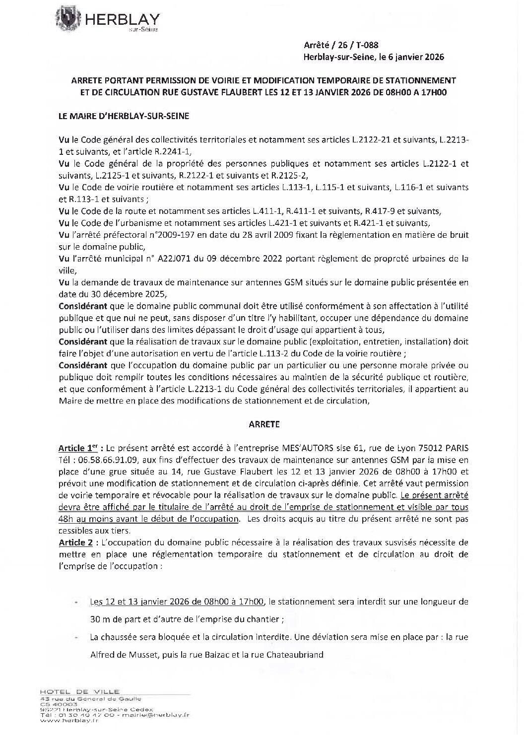Arrêté portant permission de voirie et modification temporaire de stationnement et de circulation rue Gustave Flaubert