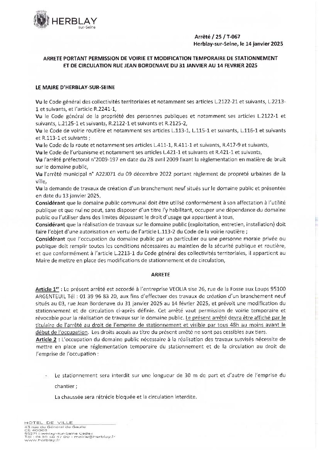 Arrêté portant permission de voirie et modification temporaire de stationnement et de circulation rue Jean Bordenave
