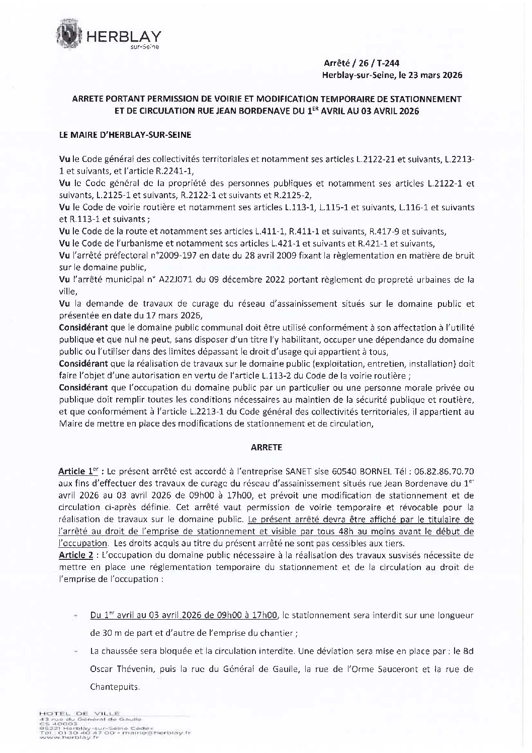 Arrêté portant permission de voirie et modification temporaire de stationnement et de circulation rue Jean Bordenave