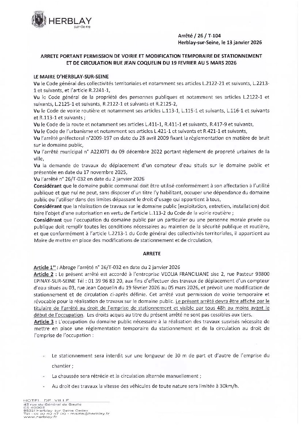 Arrêté portant permission de voirie et modification temporaire de stationnement et de circulation rue Jean Coquelin