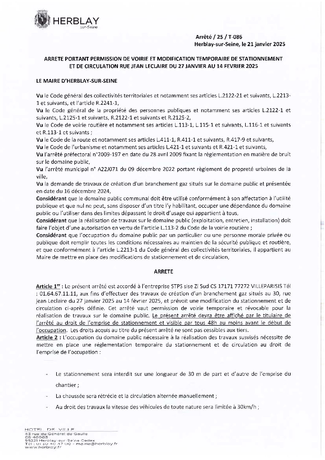 Arrêté portant permission de voirie et modification temporaire de stationnement et de circulation rue Jean Leclaire